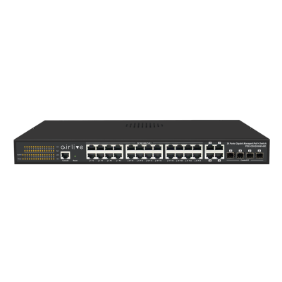 AirLive POE-GSH2404M-400 is an L2+ managed 28-port Gigabit PoE+ switch including 24 PoE ports and 4 Gigabit SFP/TP combo ports with high 400W PoE power. Each PoE port is 802.3at/af compliant of up to 30W, automatically adaptive. It supports comprehensive SNMP management function such as IGMP Ring Network, VLAN Division, Port aggregation, QoS port mirroring, bandwidth control. Providing VLAN Division Policy function for setting higher priority for Video Conference, Surveillance, Voice, or data that prevents package loss or lags. Furthermore, the PoE watchdog can detect and restart crashed IPCAM or PD, the best 24/7 PoE device guard. No manual is required, and it can provide timely and reliable solutions for later operation and maintenance of the projects.